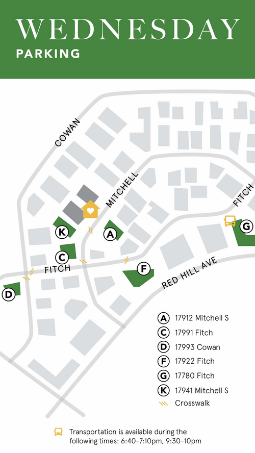Wednesday (Lot G): 6:40-7:10pm / 9:30-10pm (when Bible Study is in session)