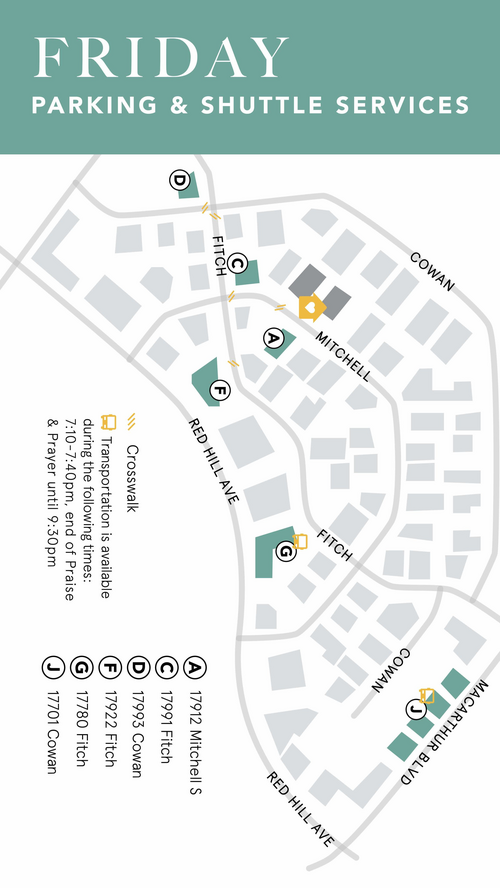 Friday (Lot G and Lot J): 7:10-7:40pm; End of Praise & Prayer until 9:30pm